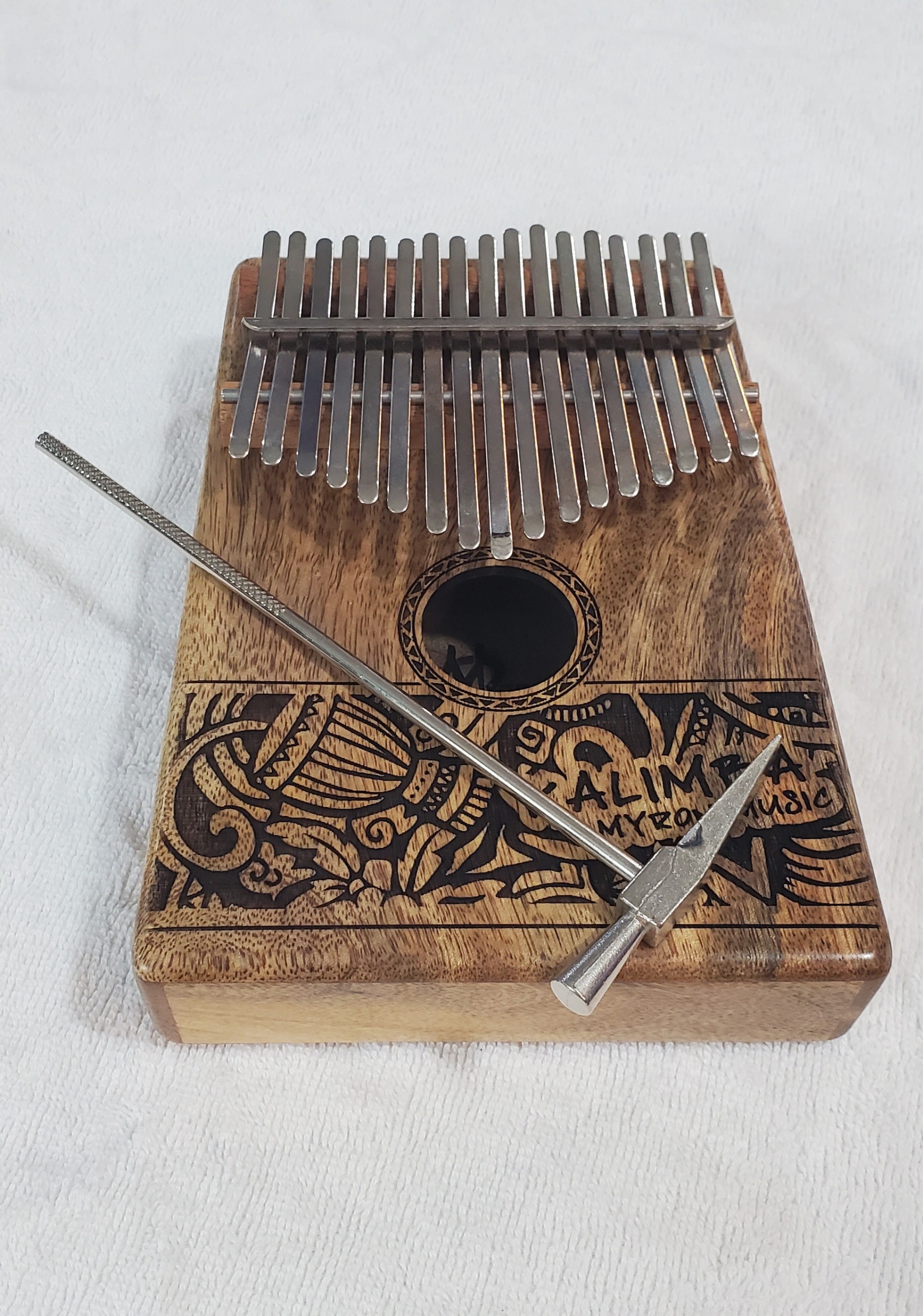 - Bộ cộng hưởng được làm từ 6 thanh mubvamaropa gỗ dán lại với nhau để tạo thành một hộp hình thang. Thông thường đàn Kalimba truyền thống được thực hiện trên cơ thể hộp cộng hưởng rỗng hoặc dạng bằng phẳng rỗng bên trong giống như thân đàn guitar. Nhưng Kalimba có hình dáng hộp cộng hưởng có âm thanh vang và vọng hơn nên được ưa chuộng nhất. Ngoài ra, đàn còn có 1 lỗ tròn lớn ở phía trước và 2 lỗ nhỏ ở phía sau.